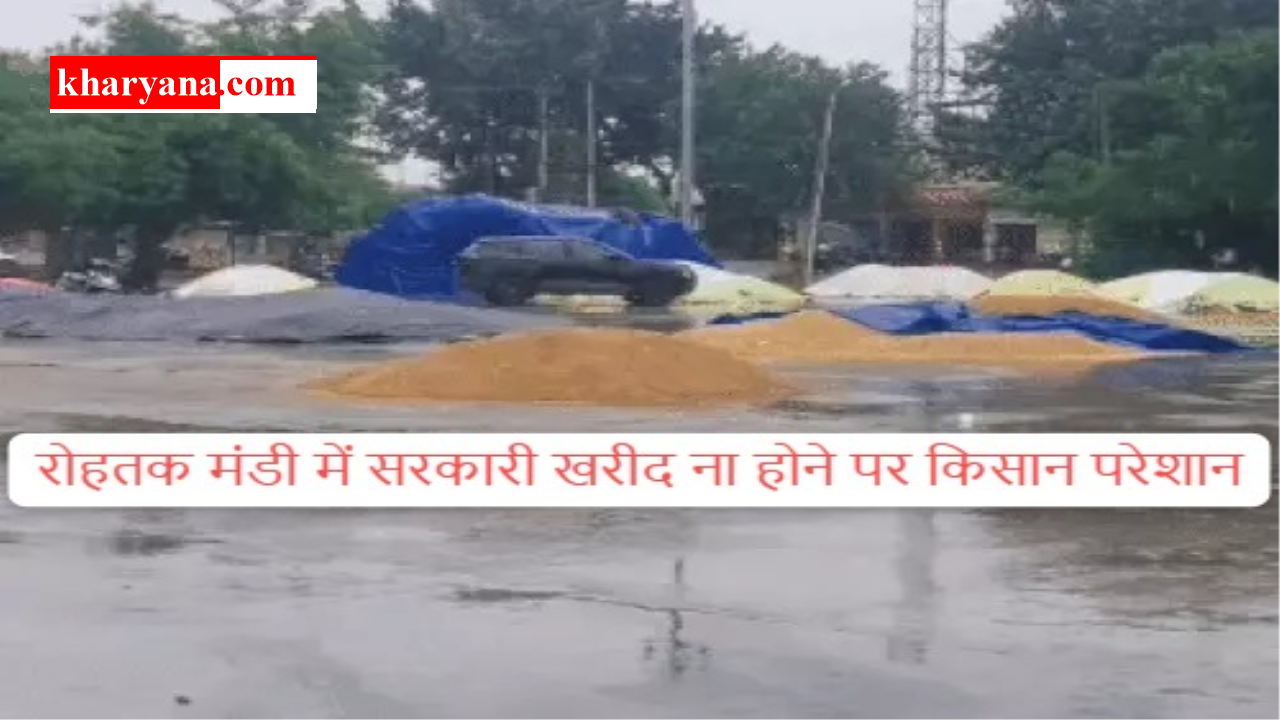 रोहतक में बरसात के कारण किसानों पर दोहरी मार देखने को मिल रही है। पहले ही धान की फसल कम हुई ओर ऊपर से मंडियों में धान की सरकारी खरीद नहीं हो रही। धान खुले आसमान के नीचे पड़ा है, जो बरसात में भीग रहा है।